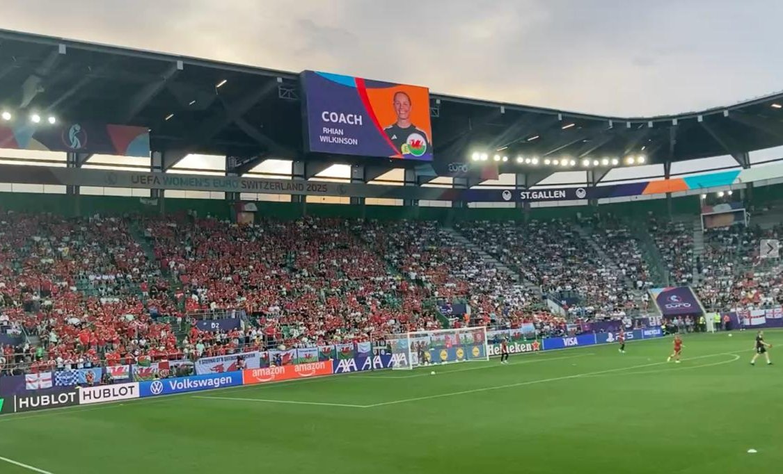 St. Gallen jumbotron announcing Rhian Wilkinson as Head Coach of Wales pre-England vs Wales